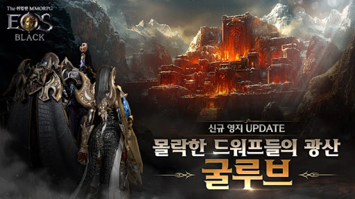 에오스 블랙에서 혼란에 빠진 세상을 구원하는 영웅이 되어보세요. 신규 영지 굴루브, 심연의 광산 던전, 4종 신규 신수로 확장된 세계와 치욕 시스템이 더욱 위험하고 치열한 MMORPG 모험을 선사합니다.